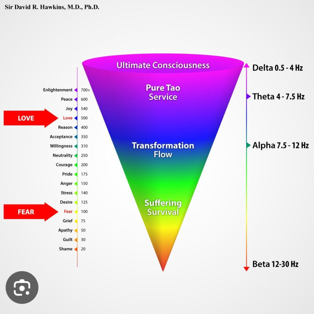 Back in 2020, I came across a book called Power vs Force by David R. Hawkins. It was very boring and the scientific experiments would probably be deemed invalid, but his "Map (Pyramid) of Consciousness" blew me away. To sum it up, emotions can make you physically stronger or weaker, and that each emotion has its own ranking within this scale. He spoke about this in terms of frequencies, which you can take or leave, but I think it’s the scale that is important. And I think we can all relate to this to some extent.